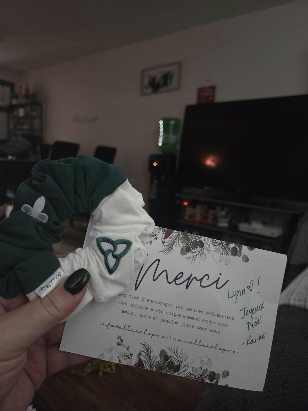 Je suis toujours à la recherche d'accessoires pour participer aux journées thèmes à l'école! Ce scrunchie est fait de superbe qualité, puis y'é cute à mort. Hâte de le porter! En plus j'ai adoré mon ptit message personalisé sur la carte!